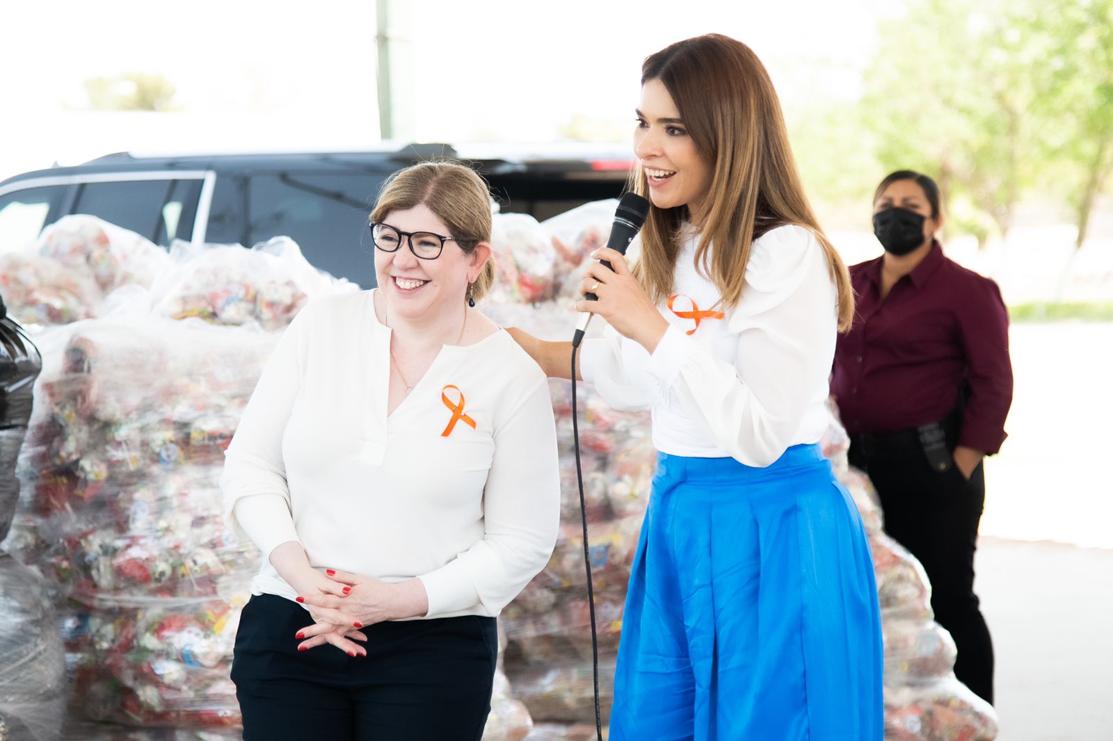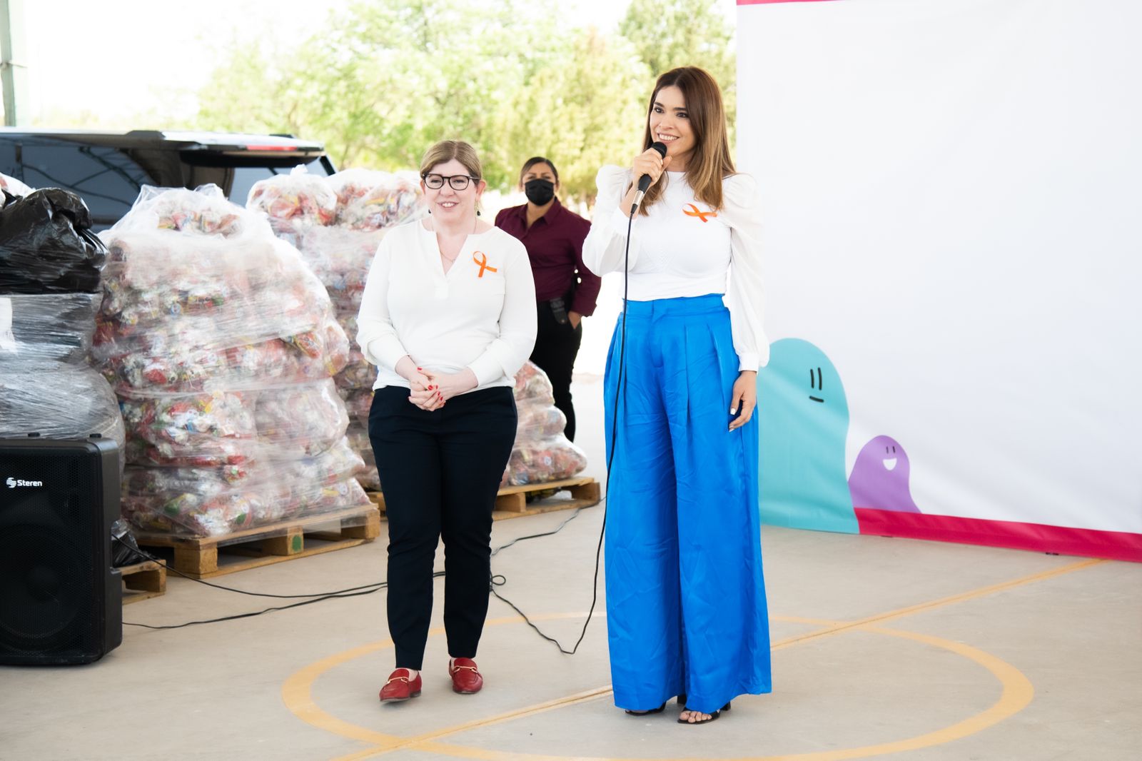 La presidenta del Sistema para el Desarrollo Integral de la Familia de Juárez, Rubí Enríquez, acompañada de la directora general, Lucía Chavira, dieron la cordial bienvenida y agitaron el banderazo de entregas a representantes de 145 escuelas en la localidad que solicitaron el apoyo de bolsitas de dulces para celebrar a miles de niñas y niños en el Día de las Infancias.