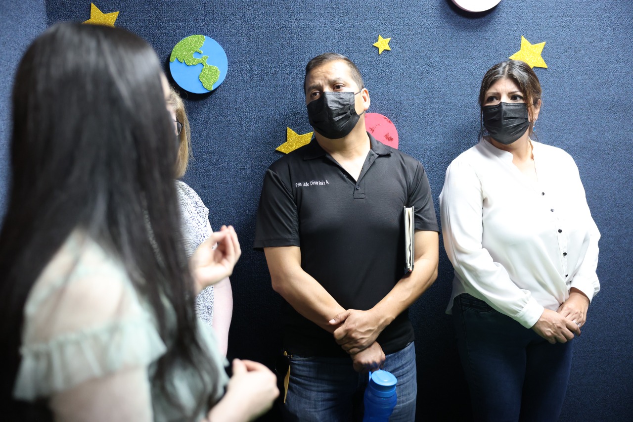 La directora General del Sistema de Desarrollo Integral de la Familia de Juárez, (DIF) Lucia Chavira, acompañada de la directora de Derechos de Niñas, Niños y Adolescentes, Teresa Vargas y del coordinador de los Centros de Atención Psicológica (CAP) visitaron las instalaciones de la Fiscalía de las Mujeres para conocer el funcionamiento del proyecto “Antenas”.