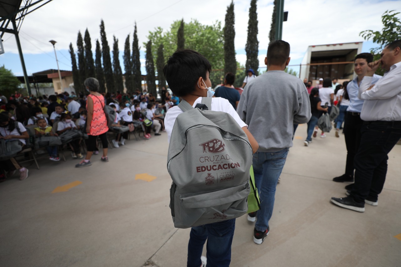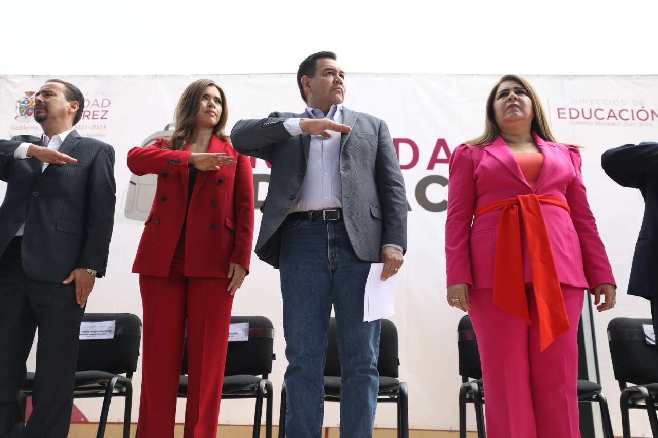 Durante la entrega de materiales, el Presidente Pérez Cuéllar agradeció a la directora de Educación, Martha Aracely González Holguín y al regidor Jorge Marcial Bueno Quiroz, por el compromiso que tienen hacia la educación de Juárez.